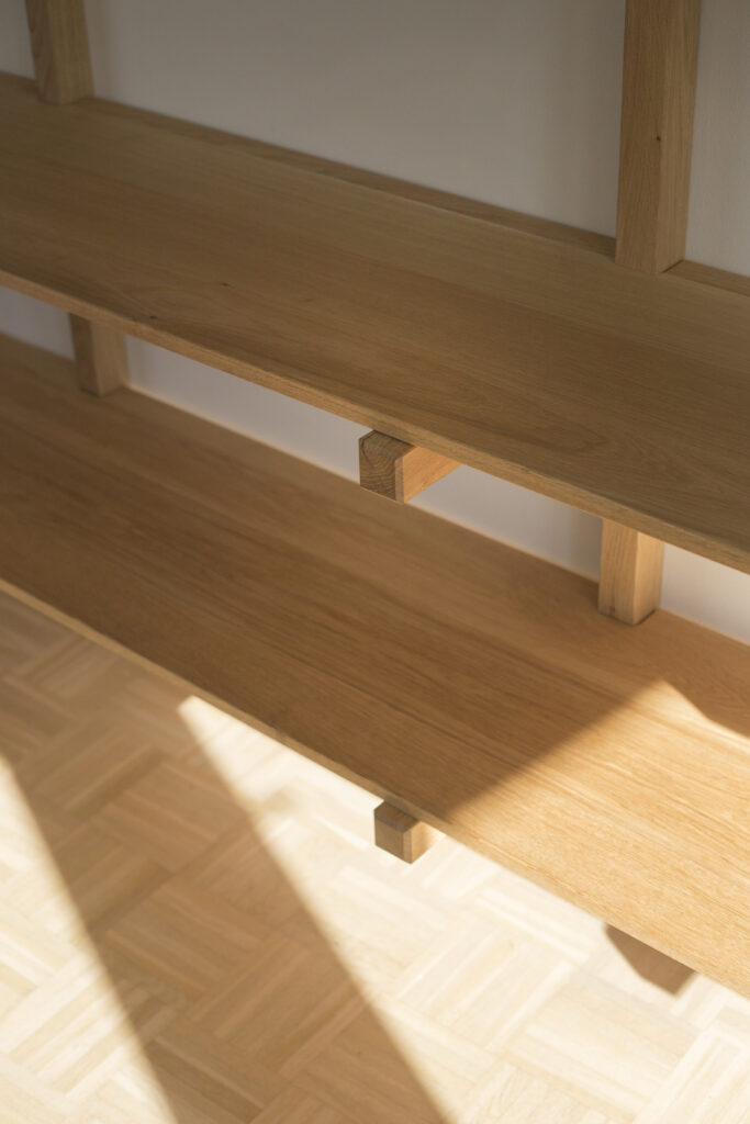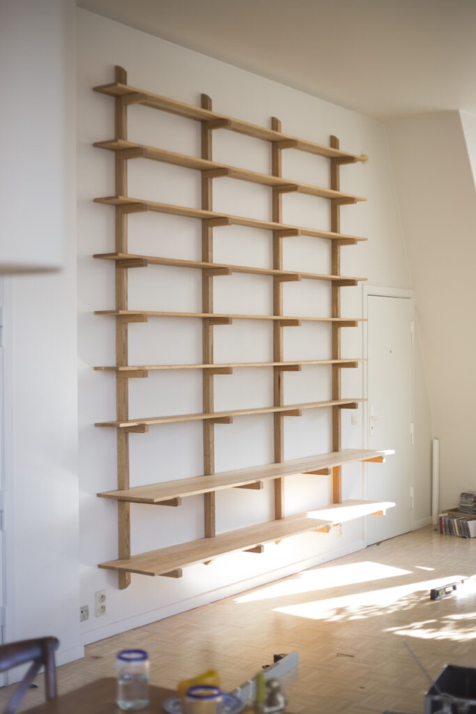 Bibliothèque suspendue en chêne massif, 280×280 cm, sur mesure